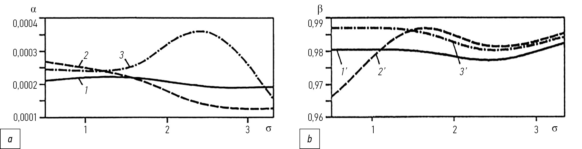 Рис. 3. Зависимости вероятностей α (а) и β (b) от среднеквадратической погрешности σ для алгоритма с адаптивным порогом без сигнала (1, 1’), при экспоненциальном (2, 2’) и синусоидальном (3, 3’) полезных сигналах.