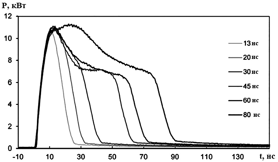 Рис. 1. Форма импульса лазерного излучения (т. е. изменение выходной мощности (приведена в кВт) во времени (оно обозначено в наносекундах)) при различной его длительности (для шести вариантов в интервале tp от 13 до 80 нс) для использованной нами системы импульсной лазерной очистки HS-LC200 (КНР) со средней по времени тепловой мощностью излучения N ≥ 200 Вт и с длительностью импульса tp ≤ 500 нс. Зависимости для формы импульса приведены по данным фирмы-производителя лазерной системы.