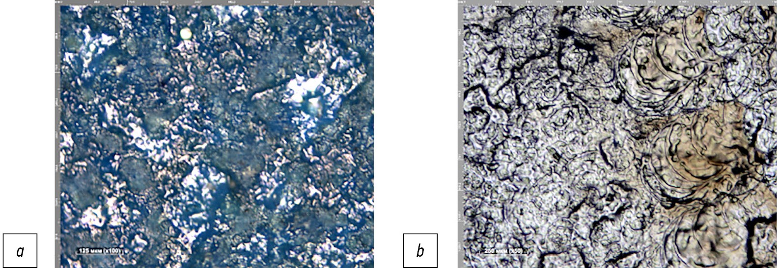 Рис. 4. Микроморфология участков стальных образцов, подвергавшихся лазерной очистке в наших экспериментах: а — вид частично очищенной от лакокрасочного покрытия поверхности в режиме № 2 по табл. 2 (при степени удаления слоя лакокрасочного покрытия α ≈ 0,30), репер на фото (слева внизу) — 125 мкм; b — вид полностью очищенной от лакокрасочного покрытия поверхности в режиме № 4 по табл. 2 (при степени удаления слоя ЛКП α ≈ 1,0), репер на фото (слева внизу) — 250 мкм.