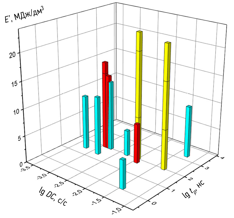 Fig. 5. Parametric dependence for a data set from three experimental laser cleaning series of different types of reference coating layers (16 points [6 + 5 + 5]) according to the authors of publications [1, 10–12]; dependence of specific energy consumption E’ (per unit area of the removed layer) on two input parameters (duty cycle DC and laser pulse duration tp).