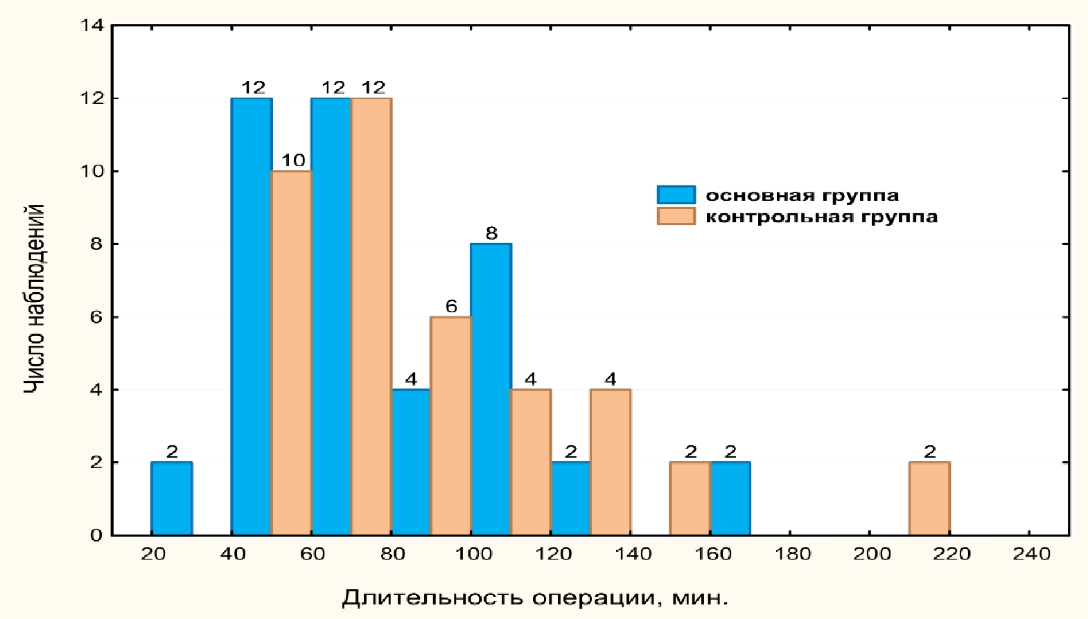 Рис. 1. Длительность операции в основной и контрольной группах (в минутах)