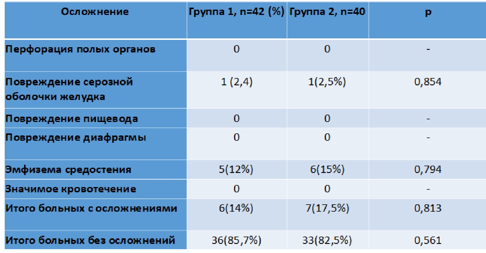 Осложнения. В основной группе интраоперационные осложнения наблюдались у 14 % пациентов (6 из 42), в контрольной группе – у 17,5 % (7 из 40). Наиболее частыми осложнениями были эмфизема средостения и повреждение серозной оболочки желудка. Все осложнения легкие и не требовали длительного лечения (рис. 2).