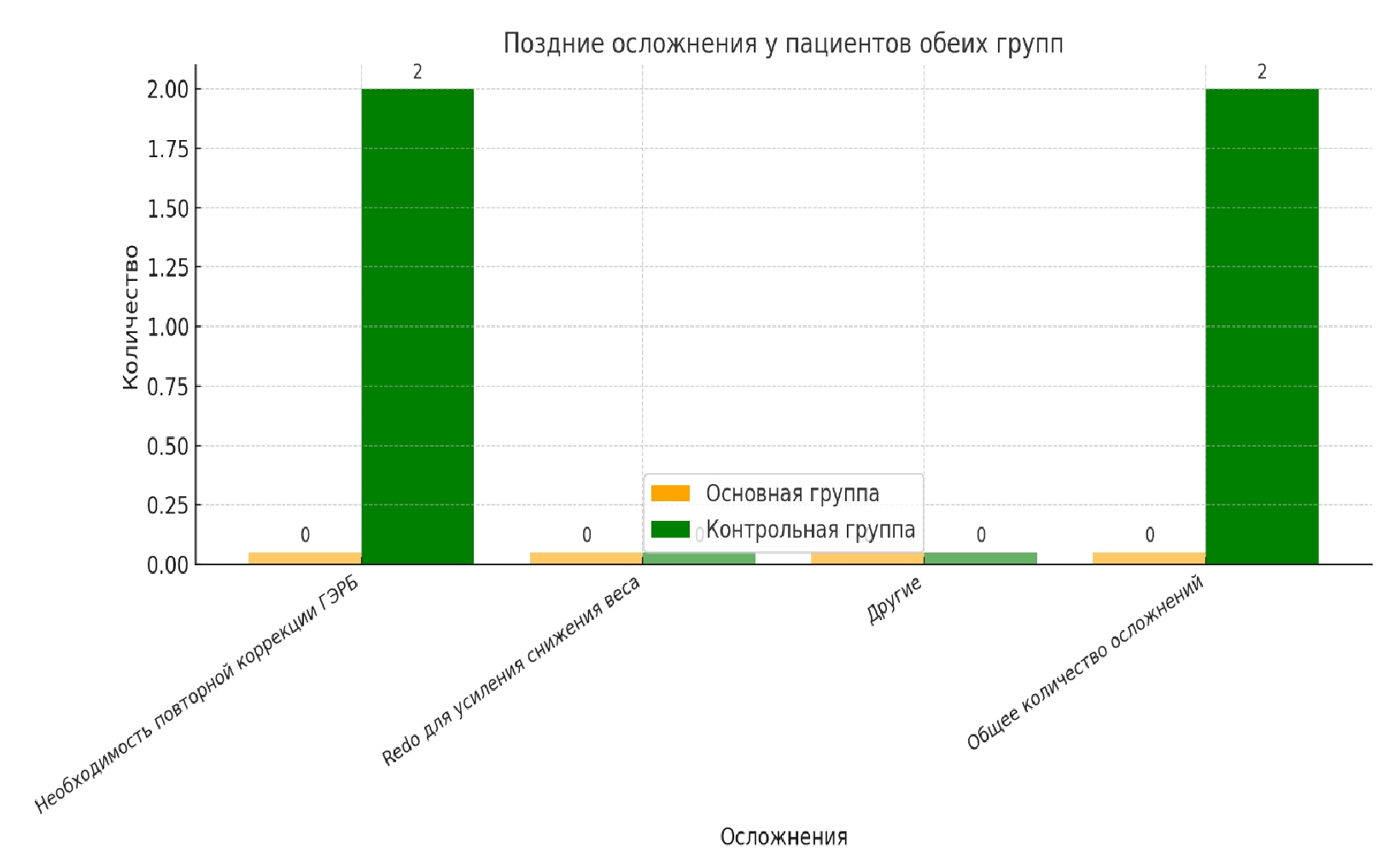 Динамика симптомов ГЭР. В основной группе у 95,2 % пациентов (40 из 42) наблюдалось полное исчезновение или значительное уменьшение симптомов ГЭРБ (изжога, регургитация, дисфагия) в течение первых 3 месяцев после операции. К 12 месяцам симптомы полностью отсутствовали у 92,9 % (39 из 42).