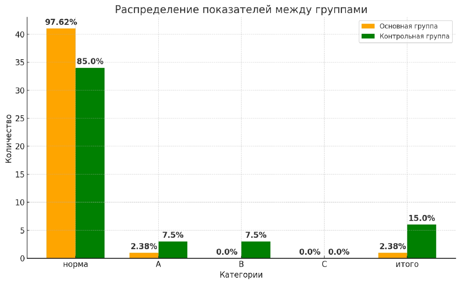 Оценка по классификации Clavien-Dindo. В основной группе осложнения I степени (легкие, не требующие лечения) наблюдались у 11,9 % пациентов (5 из 42), II степени (требующие медикаментозного лечения) – у 7,1% (3 из 42). Осложнений III степени и выше не было.