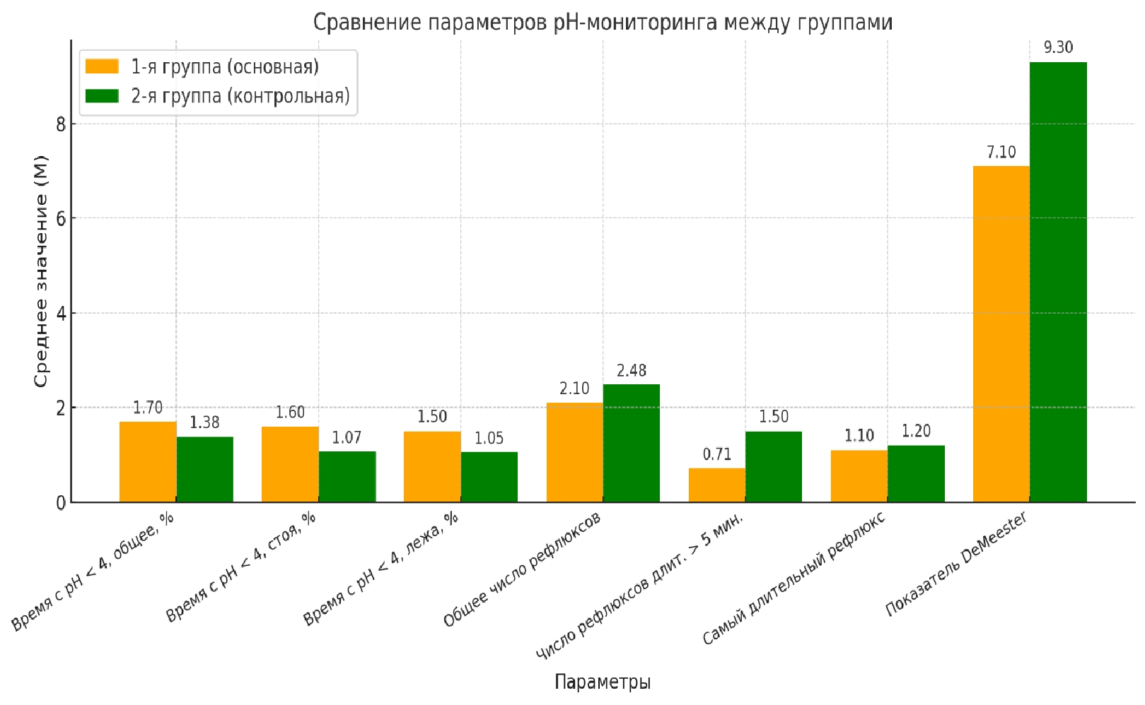 Суточная pH-метрия. В основной группе среднее время с pH < 4 составило 1,7 % (медиана 1,5 %, квартили 0,4–2,6 %). Количество рефлюксов длительностью более 5 минут было минимальным (медиана 0,2, квартили 0,2–1,1). Индекс DeMeester составил в среднем 7,1 (медиана 8,3, квартили 2,7–13,8). В контрольной группе среднее время с pH < 4 составило 1,38 % (медиана 1,2 %, квартили 0,8–2,3 %). Количество рефлюксов длительностью более 5 минут было выше (медиана 0,4, квартили 0,2–1,8). Индекс DeMeester составил в среднем 9,3 (медиана 6,8, квартили 3,7–11,9) (рис. 7).