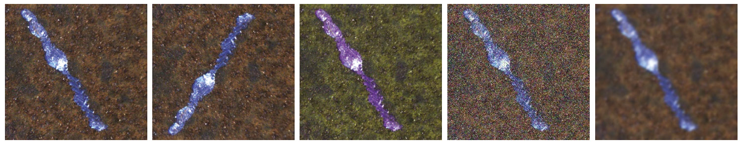 Результаты. Была разработана программа, выполняющая аугментацию выбранного загруженного изображения с последующим внесением в него различных преобразований. На рис. 1 приведено исходное изображение (слева), а также несколько сформированных из него изображений с внесенными изменениями: зеркальное отражение, изменение цвета, шум Гаусса, размытие.