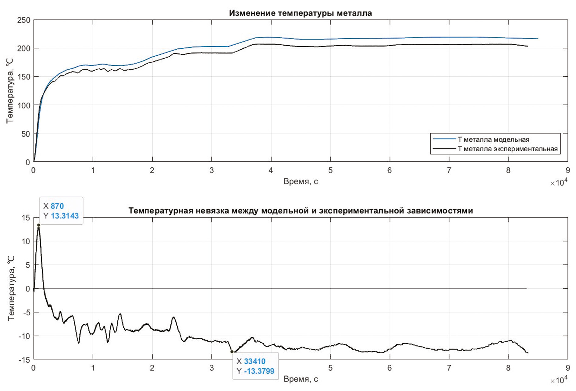 Согласно проведенной идентификации коэффициент конвективного теплообмена равен α = 620 Вт/(м2 · К) (рис. 2).